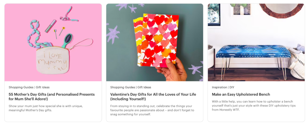 For example, the peer-to-peer e-commerce site Etsy offers 8 unique blogs aimed to attract a global audience and provide them with practical and timely DIY tips.