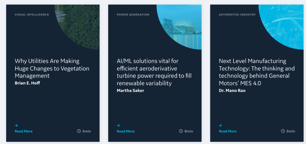 For example, GE Digital publishes long-form blog articles on digital transformation, industrial IoT trends, technical innovations, and the state of industry combining expertise from GE, analysts, customers, and partners.