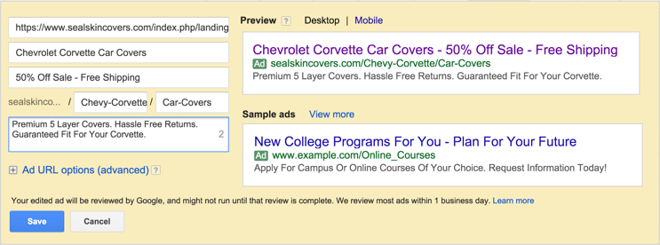 For example, an ad for our “Chevrolet Corvette Car Covers” ad group could look something like this: