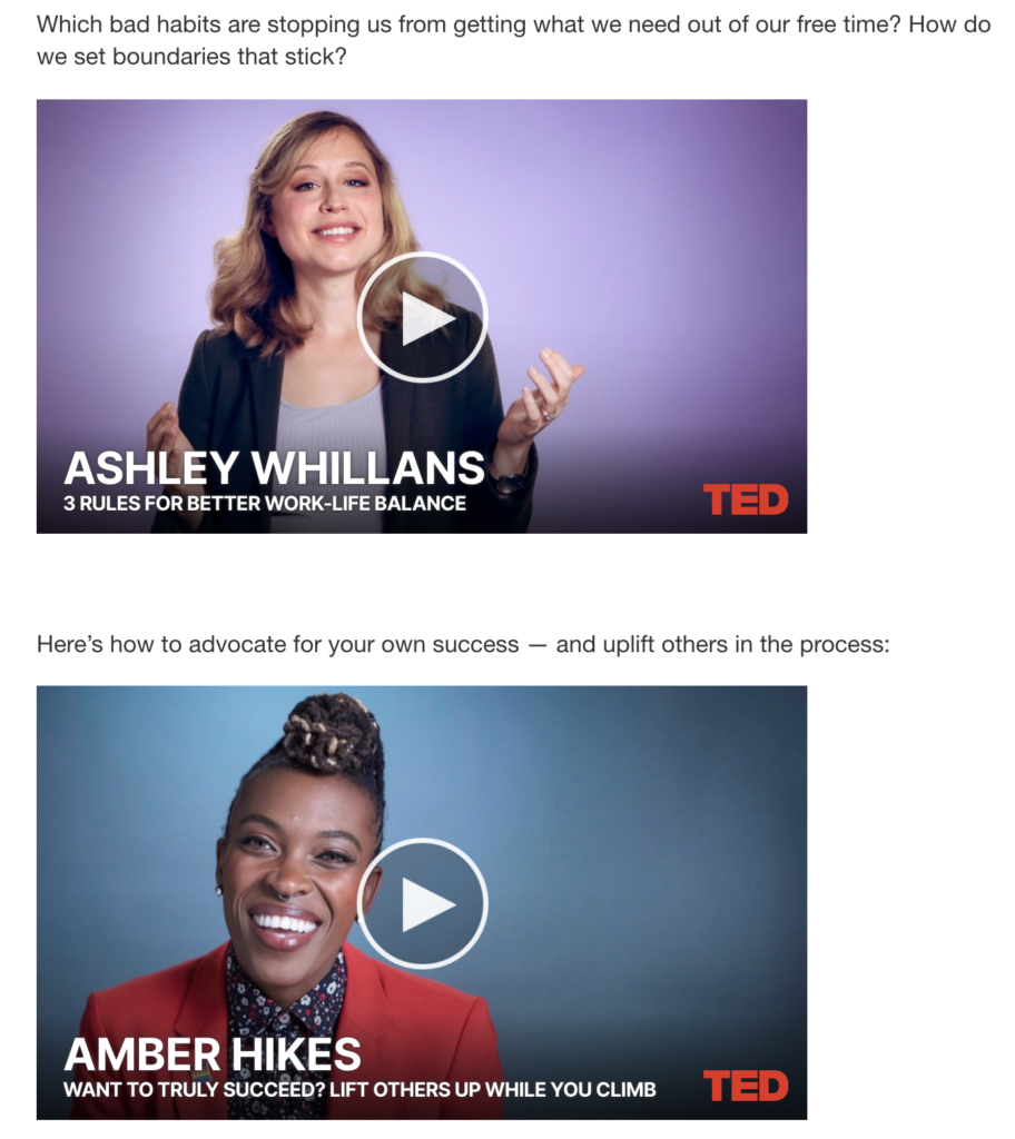 Remember, highly-visual content does not stop at pictures. You can add videos, interactive media like polls, memes, or even app-like widgets. For example, TED Blog uses videos to make its content as easily digestible as possible.