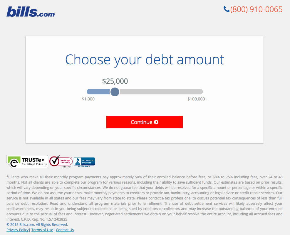 There’s only one thing that a visitor can do when they reach this page. They have to choose the amount of debt they have before they can continue on through the conversion process. By only providing one option, this landing page makes it impossible for the visitor to become distracted or overwhelmed by the conversion process. Once they finish one step, it’s on to the next until the process is complete.
